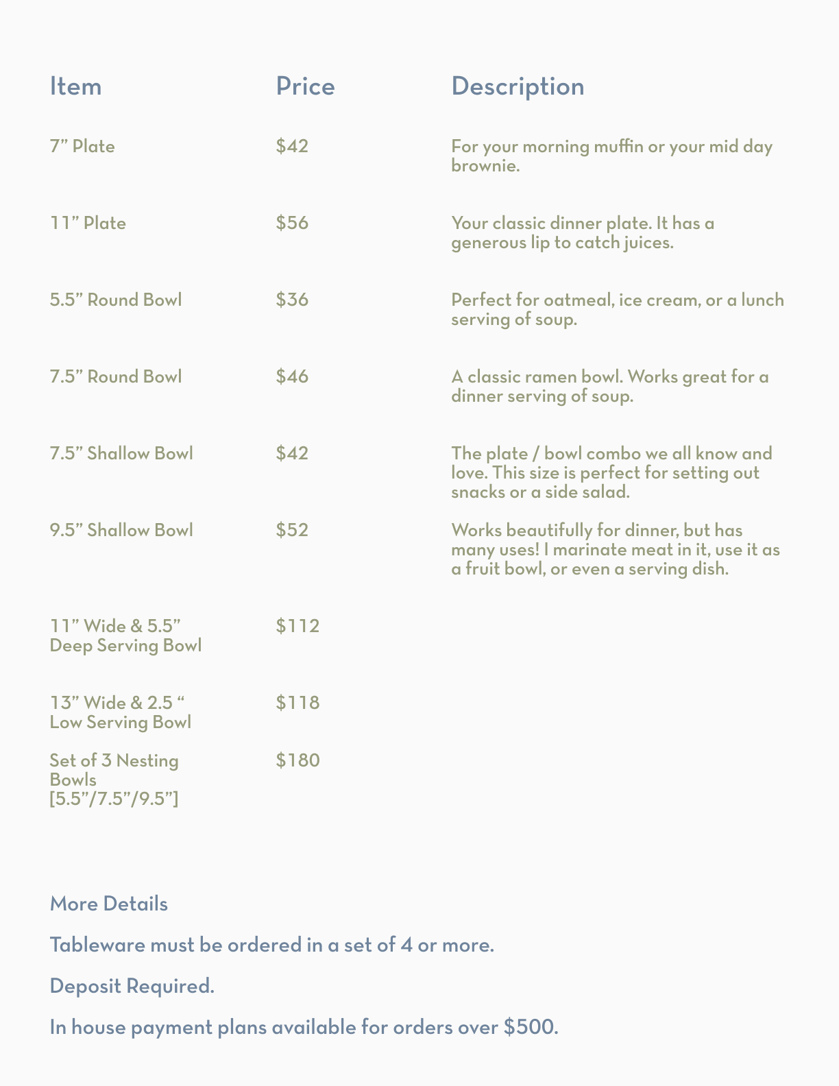 TABLEWARE DESCRIPTIONS & PRICING